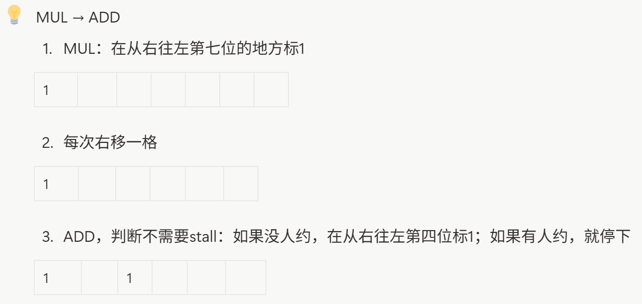 解决方法二:通过移位寄存器,在指令译码阶段跟踪写端口的使用——因为在静态调度流水线中,必定是顺序执行的,且在译码阶段已经可以计算需要 stall 几个周期,因此也可以直接结算处在什么时候写回.