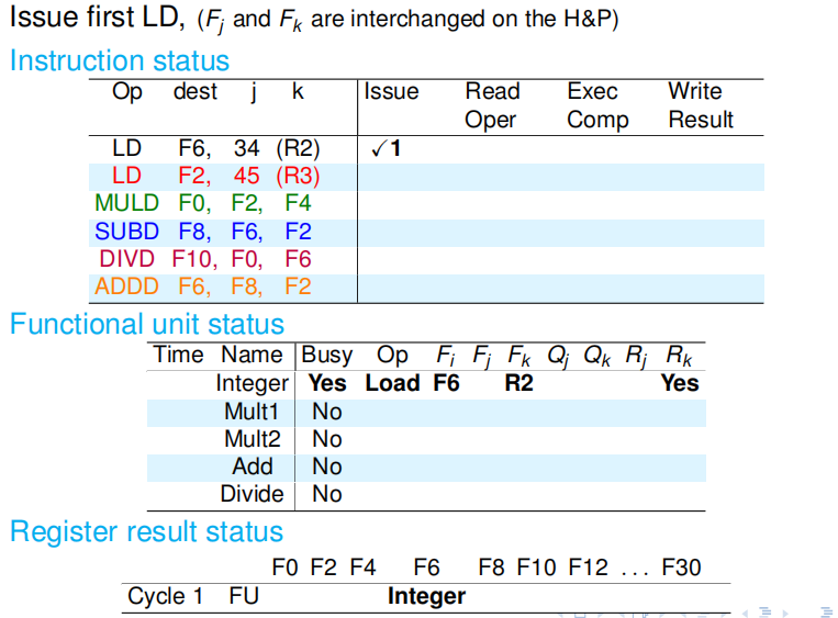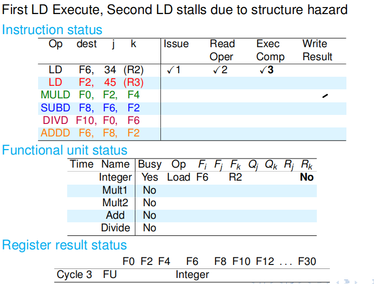 第三个周期:在流程解读一节,我们已经看到 INST 寄存器只有一个,所以发射阶段是阻塞的、顺序的.因为第二条 LD 没法发射,后面的指令都没办法发射. 第一条 LD 顺利渡过执行阶段,并在周期结束时改写了记分牌,这里主要是解放了 Rk(从 Yes 变为 No ),即表示自己不再要读取寄存器 R2. |