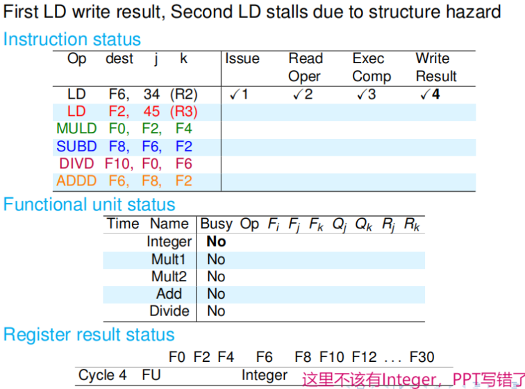 第二个周期:因为整数部件被占用了,所以第二条 LD 指令不能发射.同时第一条 LD 已经顺利渡过读数阶段,需要将 Rk 标记为 NO. 第二条 LD 在周期结束时不会更新记分牌. |