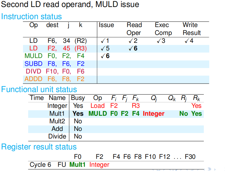 第六个周期:乘法部件有空闲,所以 MULD 顺利发射;LD 要读的寄存器的值都是最新的,所以可以读取. 周期结束时,LD 指令不会改写记分牌.据寄存器状态可知,源寄存器 F2 正要被整数部件改写,所以 MULD 要读的 F2 是过时的,因此记分牌中会打上标记,表示 MULD 指令还不能读 F2. 周期结束时,LD指令不会改写记分牌. |