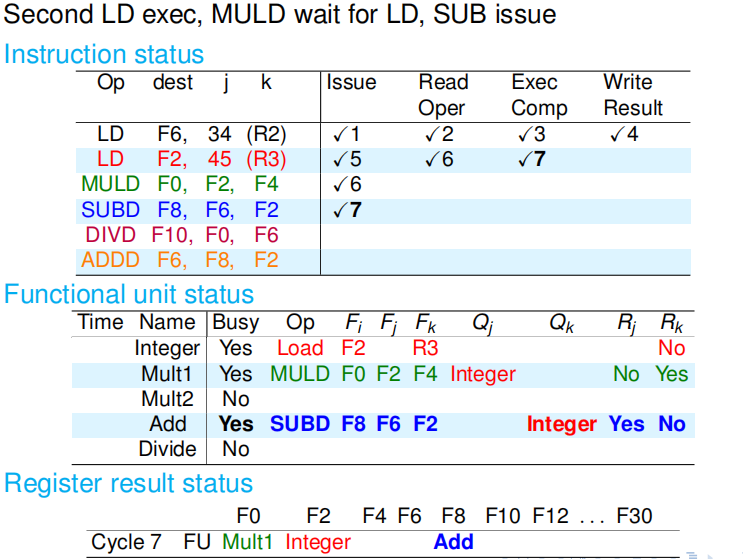 第七个周期:加法部件空闲,所以 SUBD 指令可以发射;MULD 因为记分牌告诉它它还不能读取 F2 ,所以卡在部件寄存器中,不能读数;LD 指令顺利执行. 周期结束时,SUBD 指令改写记分牌,根据寄存器状态可知,源寄存器 F2 要被整数部件改写,所以不能读,因此记分牌中标记 F2. 周期结束时,MULD 因为卡在部件寄存器中,所以没有任何动作. 周期结束时,LD 改写记分牌,主要是改写 Rk,以表明自己不再需要读寄存器 R3. |