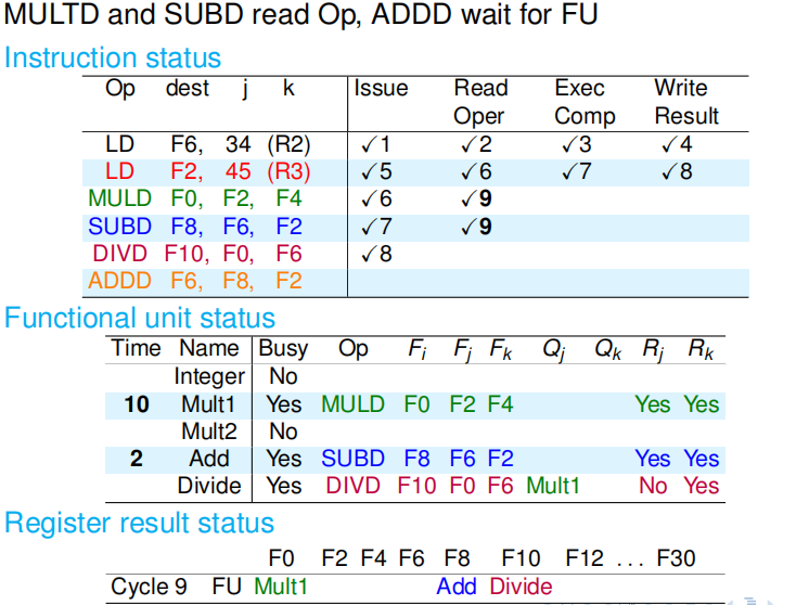 第九个周期:因为加法部件被 SUBD 指令占用,所以 ADDD 指令没办法发射;而 DIVD 指令因为要等到乘法部件 1 的结果,所以也没法读数;而 SUBD 和 MULD 两条指令因为上一周期 LD 写回完毕,所以这个周期可以读取所有它们需要的寄存器值,因此顺利渡过读数阶段. 周期结束时,功能状态和寄存器状态都没有变化.但是注意记分牌 Mult1 后面的 10 和 Add 后面的 2 ,这是在告诉我们从下一周期开始,乘法和加法将要开始各自的计算,其分别需要 10 个周期、2 个周期. |