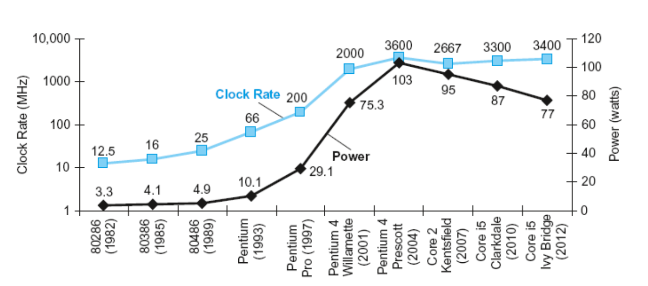- Power Wall:主频提高了很多,但功耗并没有得到这么多的提升,因为我们降低了工作电压 (5V-1V)。现在工作电压不能再降低了(否则泄漏电流占比太大),因此我们不能再提高功率了。以 CMOS IC technology 为例,其能耗(power) 公式为:(电容负载(capacitive load))