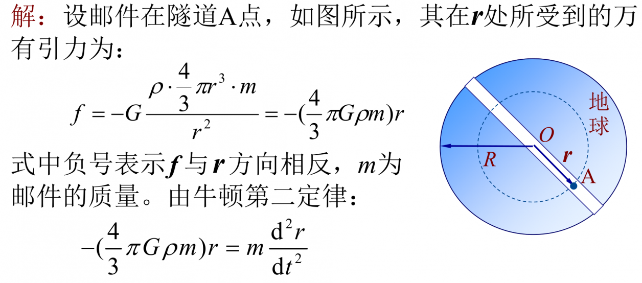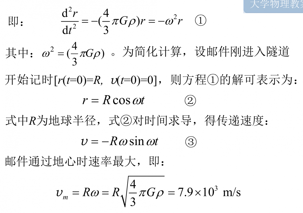 如图所示,若使邮件沿着地球的某一直径的隧道传递,试求邮件通过地心时的速率。已知地球的半径为 ,密度约为 。