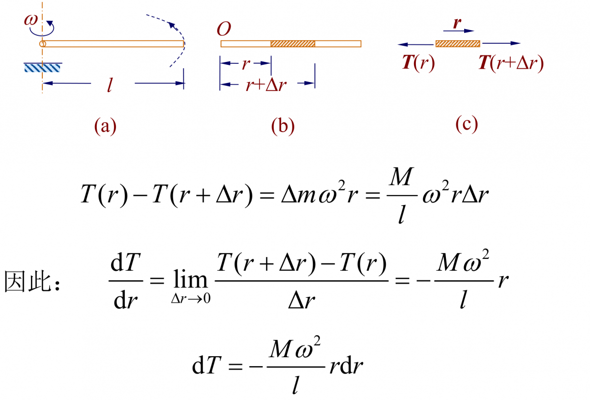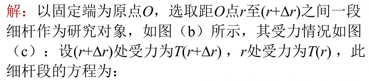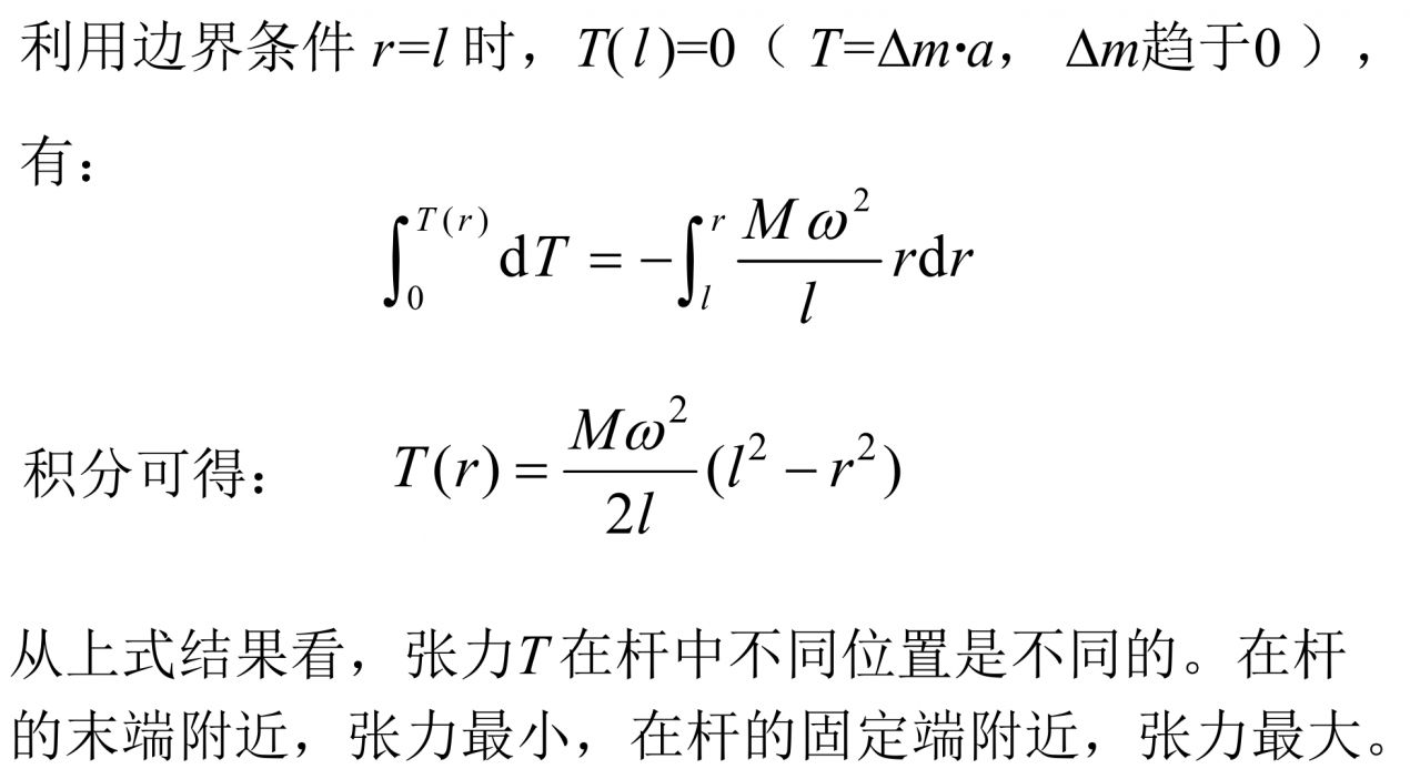 一质量为 ,长度为 的均质细杆,以匀角速度 绕固定轴旋转。设细杆不伸长,重力忽略不计,试求离固定端距离为 处的杆中的张力。