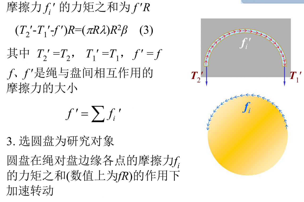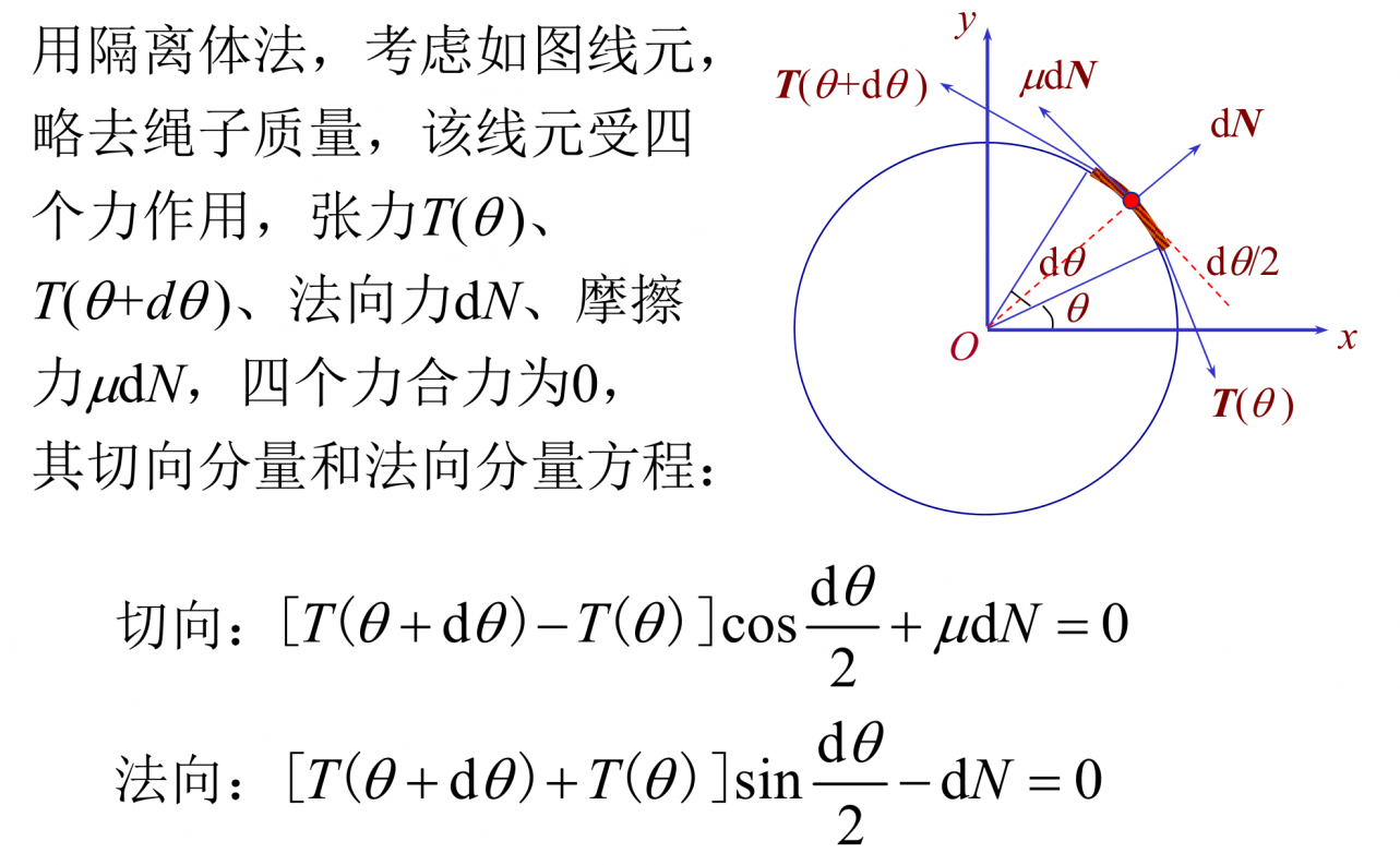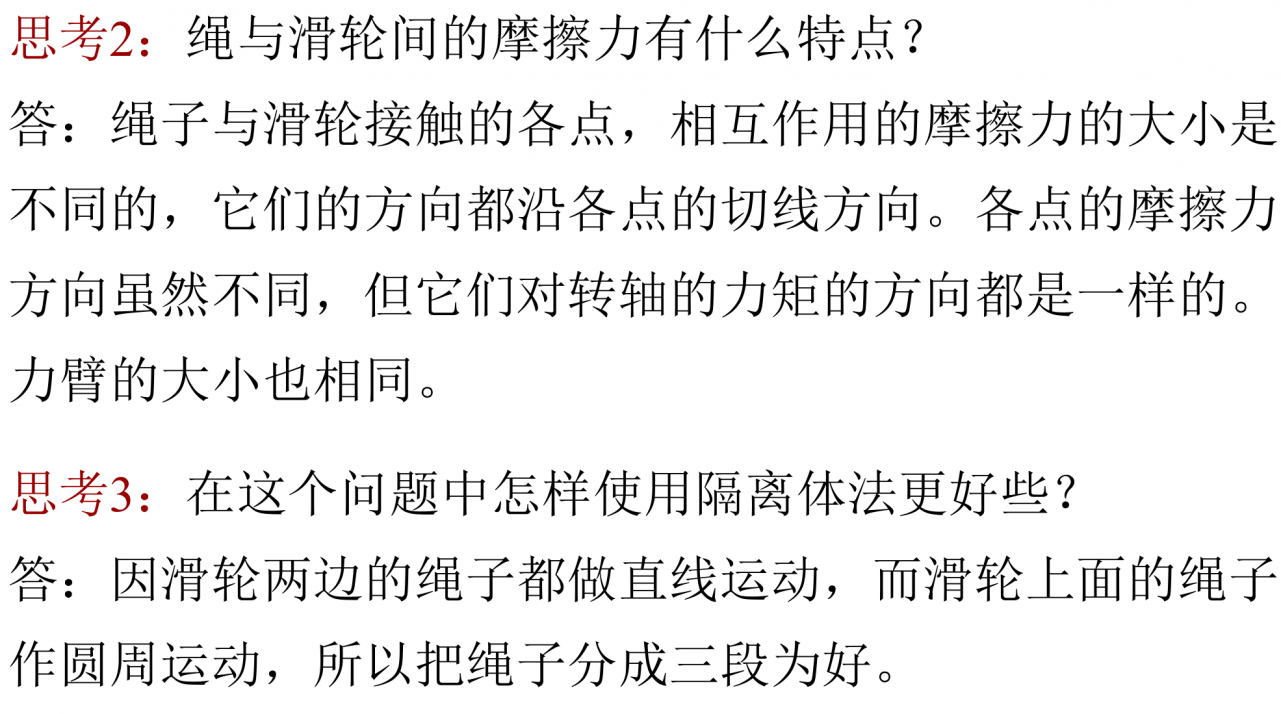 这一问题中,软绳的摩擦力不可忽略。选用圆盘为研究对象,有 选用与盘接触的弧形绳为研究对象 两式相加,可得到一个与 无关的等式。如果把圆盘和弧形绳作为整体进行分析,则摩擦力 可视为内力,不需要考虑,即 做题思路