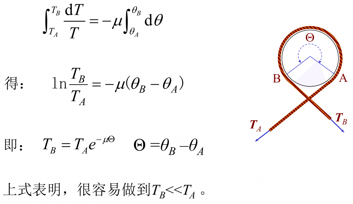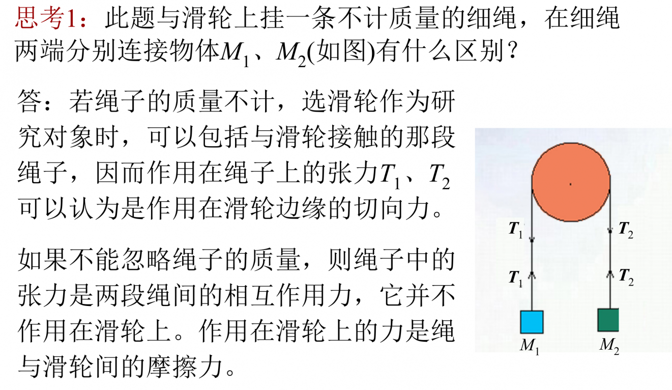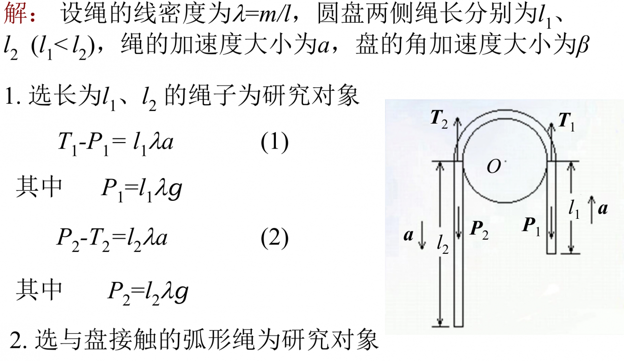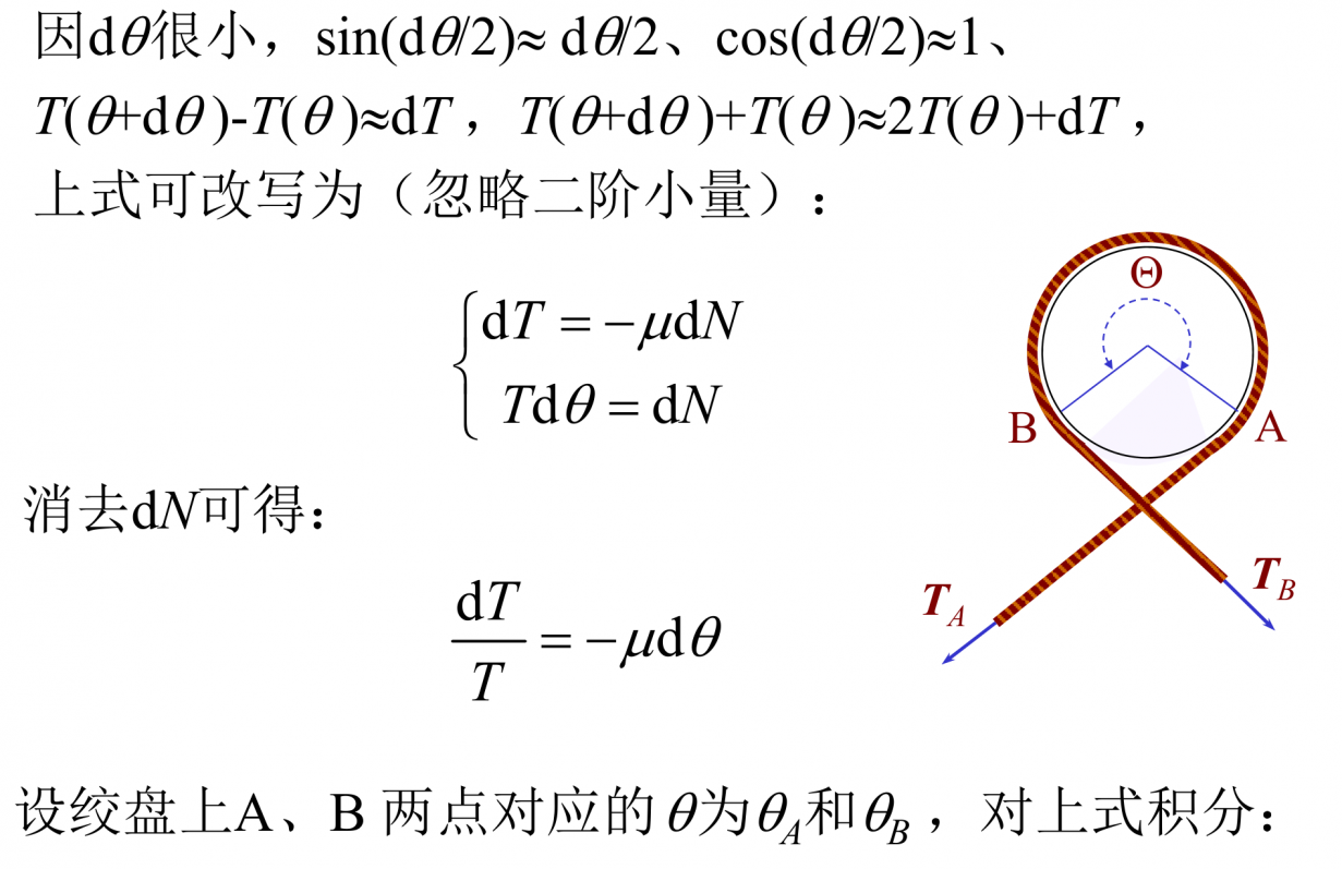 这一问题中,软绳的摩擦力不可忽略。选用圆盘为研究对象,有 选用与盘接触的弧形绳为研究对象 两式相加,可得到一个与 无关的等式。如果把圆盘和弧形绳作为整体进行分析,则摩擦力 可视为内力,不需要考虑,即 做题思路