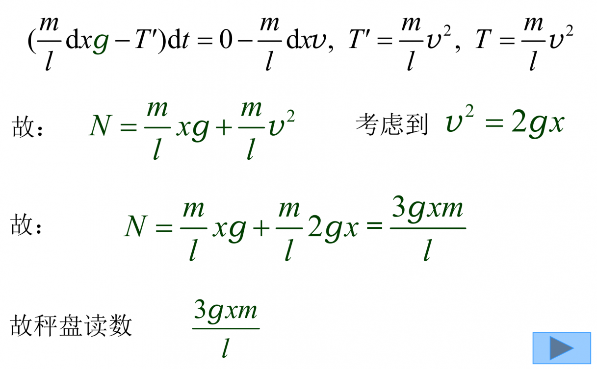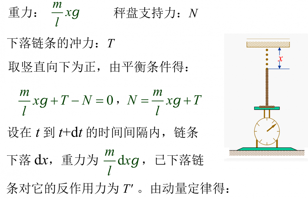 一根质量为 ,长度为 的链条,被竖直地悬挂起来,其最低端刚好与秤盘接触。现将链条释放并让它落到秤盘上,如图所示。求链条下落长度为 时,秤的读数是多少?