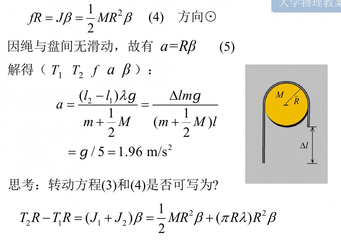 质量为 的匀质圆盘,半径 ,可绕过盘中心且与盘面垂直的水平光滑轴转动,其上挂有质量 ,长为 的匀质柔绳。设绳与盘无相对滑动,求圆盘两侧绳长之差 时,绳的加速度。