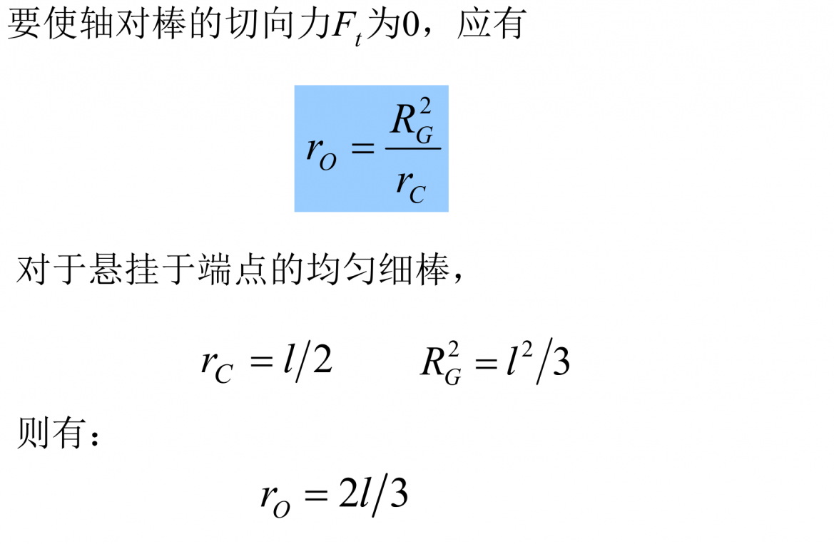 如图所示,以水平力 打击悬挂在 点的刚体,打击点为 ,若打击点合适,则打击过程中,轴对刚体的切向力 为 ,称该点为打击中心。设刚体时长度为 的均匀细杆,求打击中心到轴的距离 。